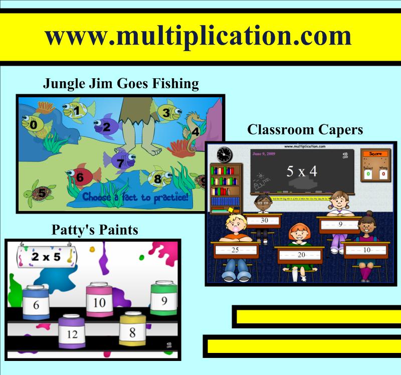 If you are a teacher or parent of a school-age child, www.multiplication.com is the best site I’ve found for practicing the basic X facts. This site includes worksheets, timed tests, hands-on classroom games, and flash cards, but the real treasure is the assortment of interactive computer games for learning individual fact families. While mixed practice is also available, it’s wonderful to focus on just the recently introduced fact family. The plethora of games includes “Classroom Capers,” “Jungle Jim Goes Fishing,” and “Patty’s Paints.”