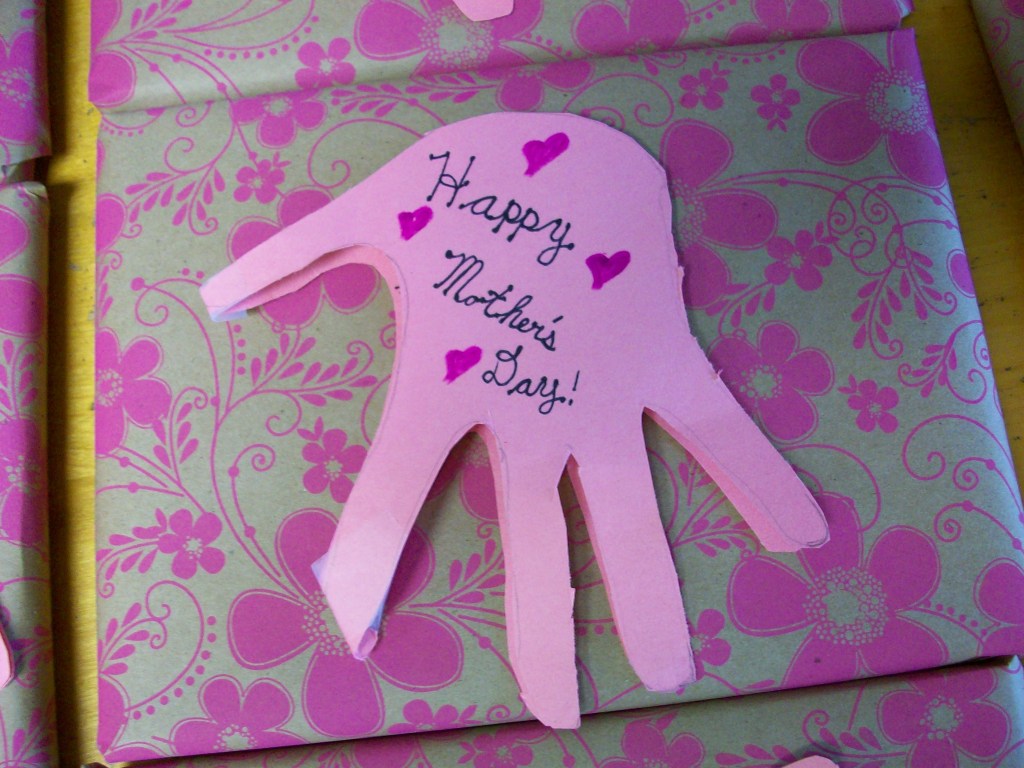 When it comes to wrapping, I like to purchase butcher paper with dainty patterns from The Dollar Tree. Since this project has a vintage feel, I try to keep the theme going. Two rolls is plenty for a class of 26 kids. The students fold a piece of construction paper in half and trace a hand with the pointer and thumb along the fold. After cutting out the double sheet, it makes a card that looks like a hand when folded, but opens up to two hands with a heart shape in the middle. It’s truly darling! If you want to take on this creative Mother’s Day craft, start at least one week early and plan to do a lot of cutting and framing in the evenings while you watch (mostly listen) to a TV show.