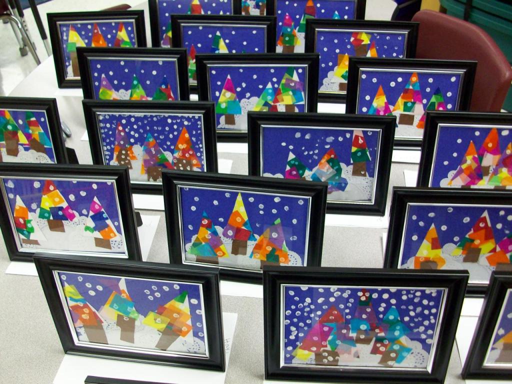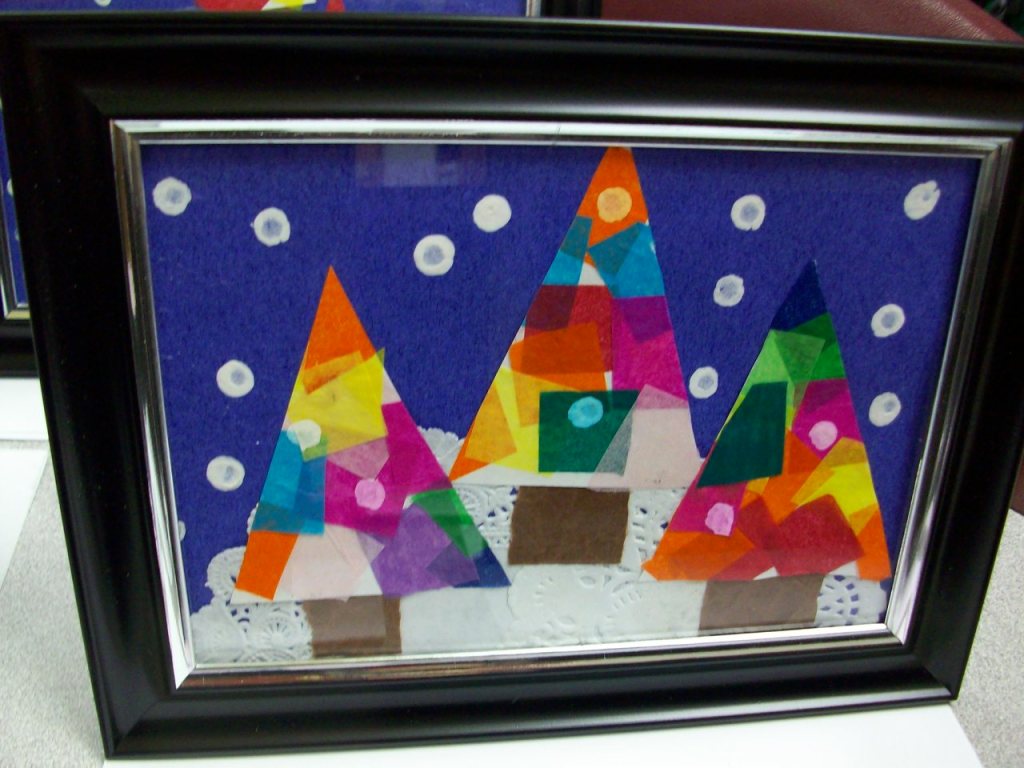 For our family gift, I guide my students in creating these collage winter scenes. Since there are a variety of religions represented in my classroom, I wanted to find something that wasn’t focused on Christmas. Even families that don’t celebrate any holidays can appreciate this craft. We start with making the blue watercolor background on white cardstock. As they dry, students use overlapping tissue paper squares (glue stick) on a large trapezoid shape of white construction paper that we later cut into the three trees. Torn and crumbled brown butcher paper makes the textured trunks. A small and mini doily cut in half make the snowy hills. And we finish off the collage with Q-tip dots of white tempera paint for the snowflakes. I prefer the kids use a glue stick rather than goopy glue on the construction. After a night under some heavy dictionaries, I frame each one ($1 each at The Dollar Tree). The students use a silver Sharpie marker to sign and date their works of art on the black cardboard frame backing. (Parents will want to remember the year and grade when looking at it in years to come.) The kids also wrap the gifts and create cards before taking them home the week before winter break. Colorful. Creative. Cute.
