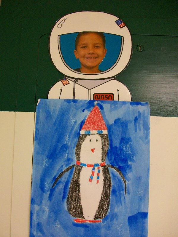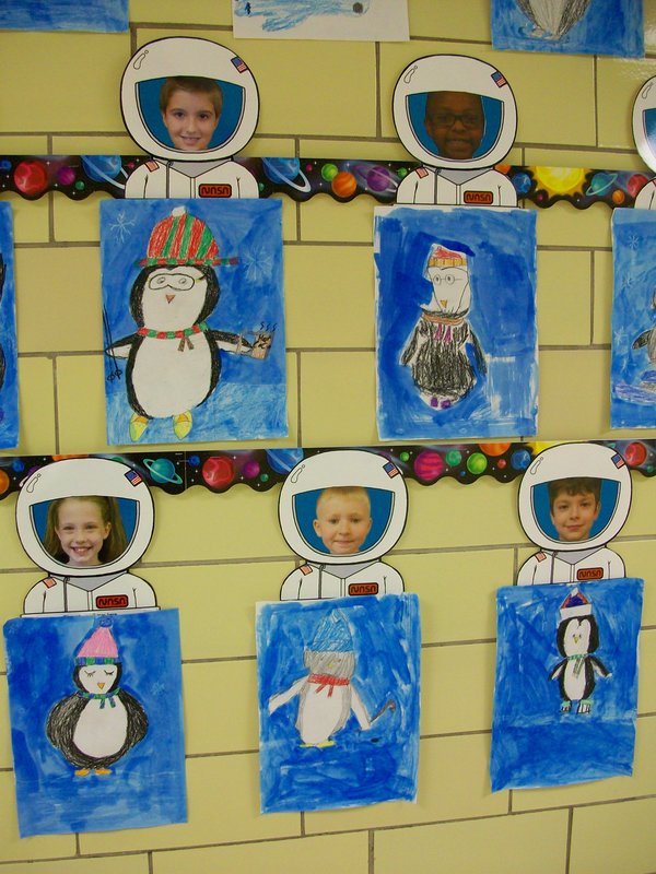 Listening skills + mystery drawing = art! These penguins are just adorable and truly reflect each student’s unique personality. It began as a directed drawing activity. The students didn’t know the final product would be this Antarctic bird. They had to listen to my directions (such as draw a large oval in the bottom half of your sheet or draw a triangle on top of the circle) and sketch with pencil. Eventually, they figured out that we were creating penguins. They had extra time to add accessories like a scarf and mittens. A few students included ice skates, glasses, etc. They colored using crayon and placed several snowflakes in the negative space. Finally, we used blue watercolor pain to create the wintery background and reveal the falling snow. After a night under our heavy dictionaries (so many uses), they were ready to display in the hall!