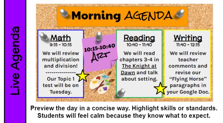 If you preview your plan for the synchronous day, students will have fewer questions and feel more comfortable. But keep it simple. Kids just want to know the gist. This is the Google Slide I present during our morning meeting. From 9:00-9:15 I greet the students, share reminders, do check-ins, integrate digital citizenship, and present our social-emotional curriculum. As you know, I color code everything, so on this agenda page math is outlined in blue, reading is green, and writing is yellow just like their physical materials and my lesson slides. I think the colors help student categorize and organize. The stars represent our 10-minute breaks. Our schedule is consistent every day, though there is an occassional special event that requires some adjustments. Simple and consistent is key, but flexibility is definiitely present.