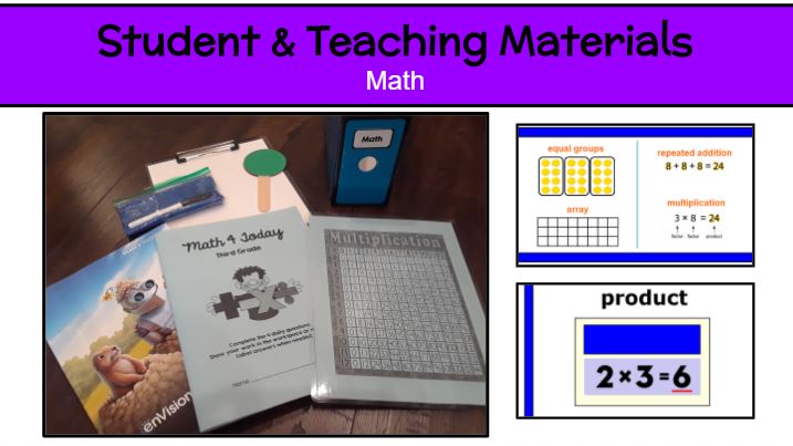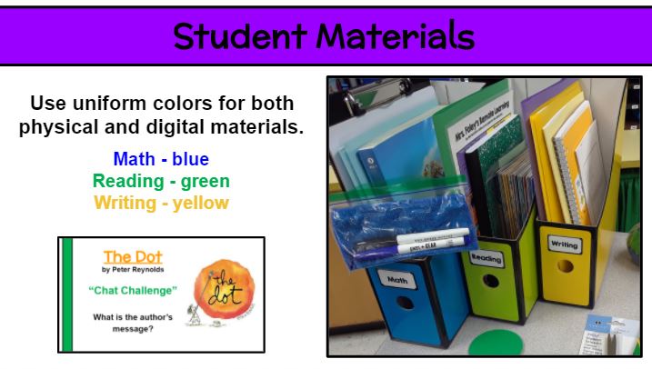 I love to color-code everything! I highly suggest selecting a color for each subject and using it for both physical and digital materials. Choosing uniform colors starts with the supplies you are provided, such as workbooks. Since our math workbook is blue, I made the other math materials that color. Since yellow spiral notebooks were provided as a student supply this year, I made all writing materials yellow. The uniform colors will help kids and families categorize content. Magazine files make great subject totes. Remember to use a splash of these colors on your presentation pages to tie it all together. Check out the at-home classroom I provided each of my students for remote learning (3 subject totes, clipboard, dry-erase board with markers and eraser cloth, workbooks, journals, folders with resources, Scholastic News magazines, books, red/green communication paddle, etc.).