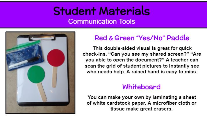 During your remote lessons, do you find it’s difficult to know if a student is volunteering. A raised hand is easy to miss. Avoid the confusion and wasted time by creating two-sided red/green communication paddles for each student. I laminated red and green cardstock circles, taped a jumbo popsicle stick onto one circle, then used a strong tape rolled into cylinders to sandwich on the other circle. Prepping these communication tools in advance will greatly help your students and the flow of your lessons. Be deliberate in using the yes/no paddle. Say, “Paddles ready!” and then ask your yes/no question. Scan your meeting grid to quickly and clearly see responses.