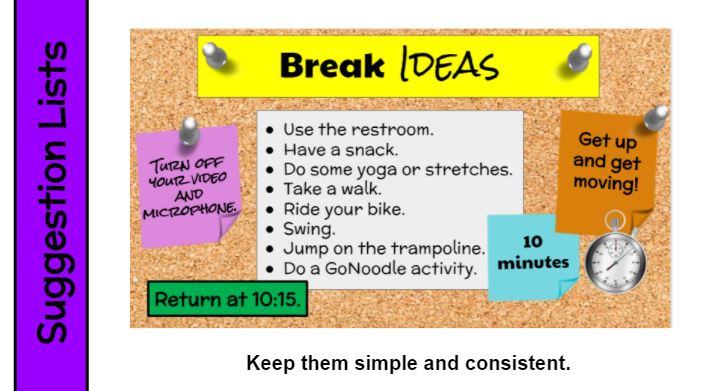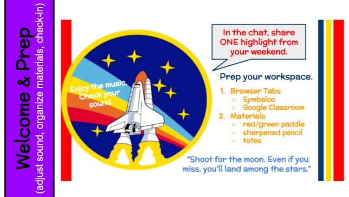 This gave me time to take silent attendance and assist students with tech issues. The others weren’t bored or annoyed (hopefully) during this time. Instead, they were preparing their work space and selves for learning. Plus, it was a daily opportunity for community building because many times the chat questions were personal. The entire “welcome and prep” time is the five minutes before the official start time, so no time is lost, but A LOT of time is gained. We begin right at 9:00 (or 9:01) and have a smooth ride!