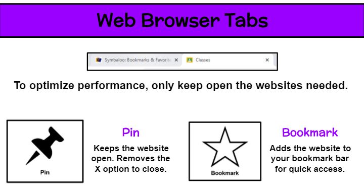 To avoid the accidental closure of a needed tab, I teach students how to pin and bookmark sites as well as the difference in their uses. By right clicking on a website tab, the Pin option (push pin icon) keeps the site open. In fact, it removes the X completely. In order to close it now, the user must right click on the tab again and select Unpin to view the X. I highly encourage pinning a website when students are taking an assessment. Although some tasks may be autosaved and allow the student to pick up where they left off, pinning will help you avoid those scares. The Bookmark option (star icon) is used to collect often used sites in a list. Those appear in a bar along the top of your browser and additional ones can be located by clicking on the >> at the end of the row. Users can rename bookmarked sites by right clicking and editing or rearrange them by clicking the title and dragging it to a new spot on the bar.