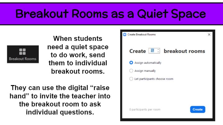 Breakout rooms are great for small group discussions. But what about using them for individual students. A large whole-class virutal meeting is never truly silent and free from distraction. So how can students spend time reading or thinking in that setting? Why not put each student in an individual breakout room for that 5-20 minutes of time? Then everyone can read to self, practice fact fluency, watch a video (hopefully without streaming issues), and the like. Of course, it is important for for students to be supervised at home or generally responsible. As the teacher, you can pop into each breakout room to check in on kids and have individual conferences. Keep them on their toes by not saying ahead of time which kids you will meet with. If a student needs help or has a question while in the solo setting, he/she can use the digital “raise hand” feature to summon the teacher.