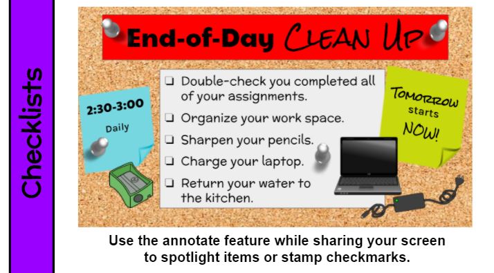 What to do before/after class or during breaks must be directly taught and reinforced daily. If there are options, include a list with the most important at the top. You can also divide a checklist into MUST DO and MAY DO categories. Whether your list is a bulleted (options) or consists of check boxes (required tasks), be sure to include the time frame (10 minutes, 2:30-3:00, return at 10:15) as well as other expectations. Keep it simple. Keep it consistent. Review often if not daily.