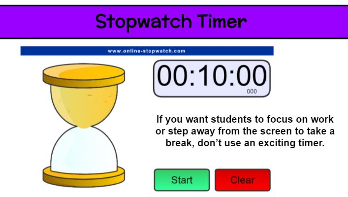 Link the site http://online-stopwatch.com to your presentation pages (or bookmark) for quick access to timers. If you want students to focus on work or step away from the screen to take a break, use the less exciting ones. I have used this resources for many, many years. What a great visual for students to manage their work time. Be sure to check your volume level in advance so you don’t scare the pants off of the kids!