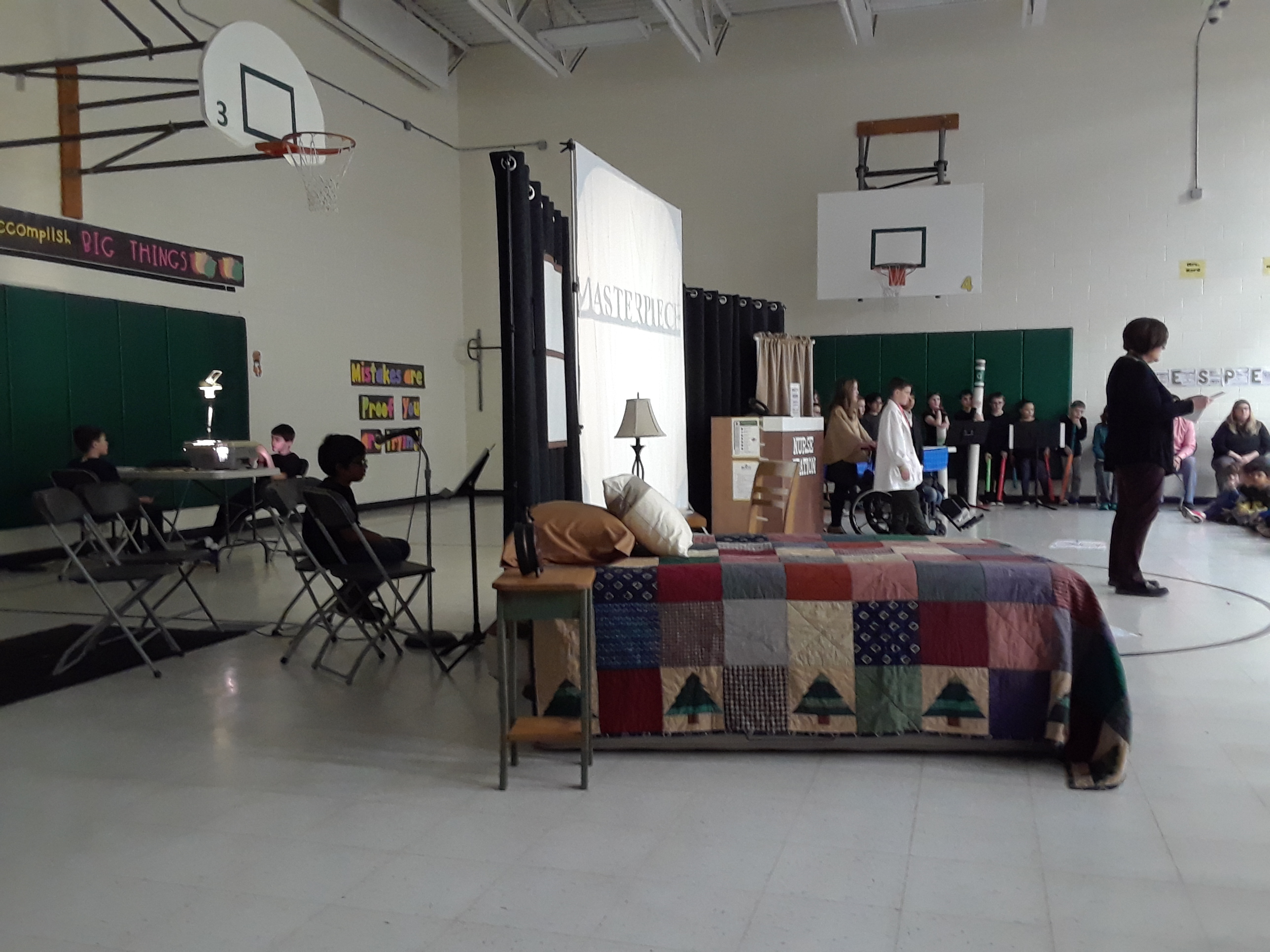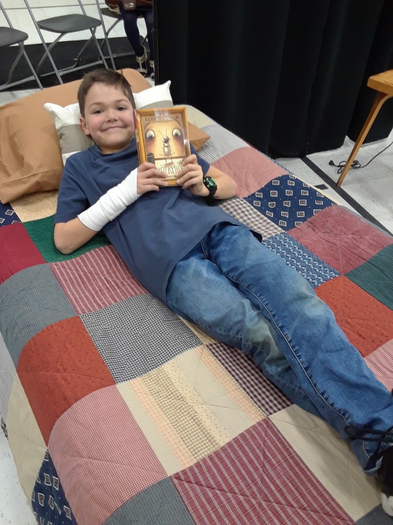 As our five-week whole-school novel study came to a close, we wanted to celebrate as a community. So again this year we orchestrated a readers’ theatre of the final chapters. My third graders continue to amaze me. And I really challenged them this time! Not only was there acting and instruments, I also added shadow puppetry! We had 3 narrators, 12 musicians, 3 puppeteers, and 7 actors. The addition of the black curtains and frames helped hide the puppeteers and voice actors who played the beetles. I was able to purchase those thanks to a Thrivent Action Teams grant. Oh, and the music teacher and I collaborated on an original song for Masterpiece! I wrote the lyrics and she set it to a melody. Listen to it here. (My 6th-grade daughter played it on her guitar.) The kids played and sang this chorus several times during the play. And since the music teacher taught it to all of her classes the week of our performance, the audience was able to sing along. Our first sing-along play! This was a readers’ theatre with lots of new elements. I absolutely LOVED the challenge and chance to be creative! Finally, every student was surprised with a gift–their very own sketchbook and felt-tip pen, like James in Masterpiece, though he had an ink set. That would have been a little to messy and expensive for all 480 students. Again, a big thanks to a Thrivent Action Teams grant for the purchase of the sketchbooks. What a thrill!