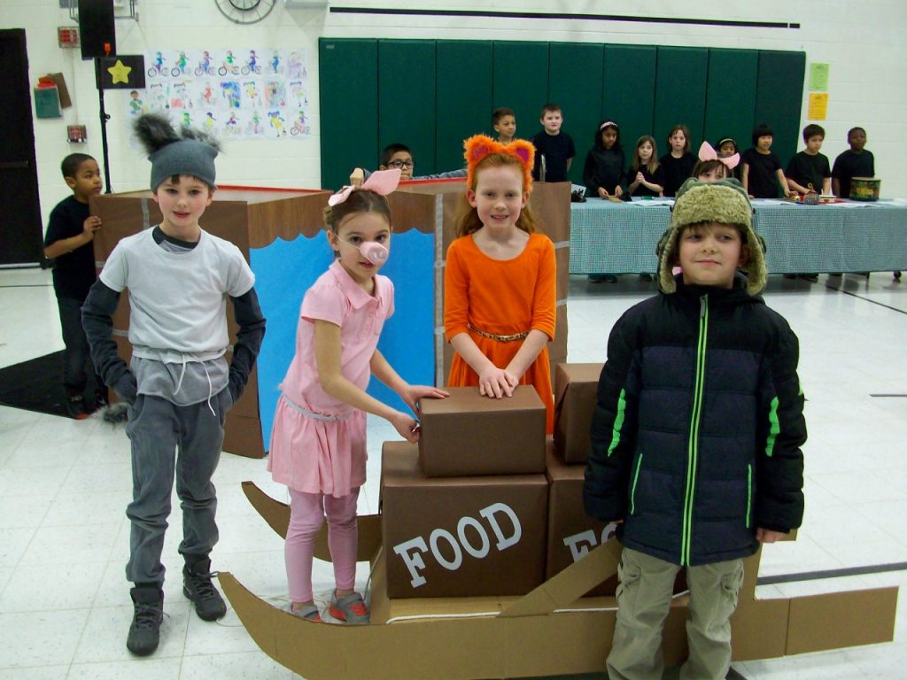 Readers’ theatre plays are my JAM! It is so much fun to take a story (in this case a 288-page novel) and turn it into a play for kids to perform. Yes, it is very time consuming–script creation, costumes, props (full-size working sled!), scenery, musical accompaniment, choral song, and choreography. Plus with the timing of it all, there is a quick turnaround for the students to learn the parts because the closing assembly is right as everyone finishes the book. (I had to read the last week’s chapters on Monday and Tuesday in order to give my students time to practice the final pages of the script prior to the performance on Friday afternoon.) Two parents volunteered to make their children’s costumes, and that helped a lot! And our wonderful music teacher took my lyrics and set them to a beautiful melody. This production was quite a feat, but so magical! Aren’t they the cutest!