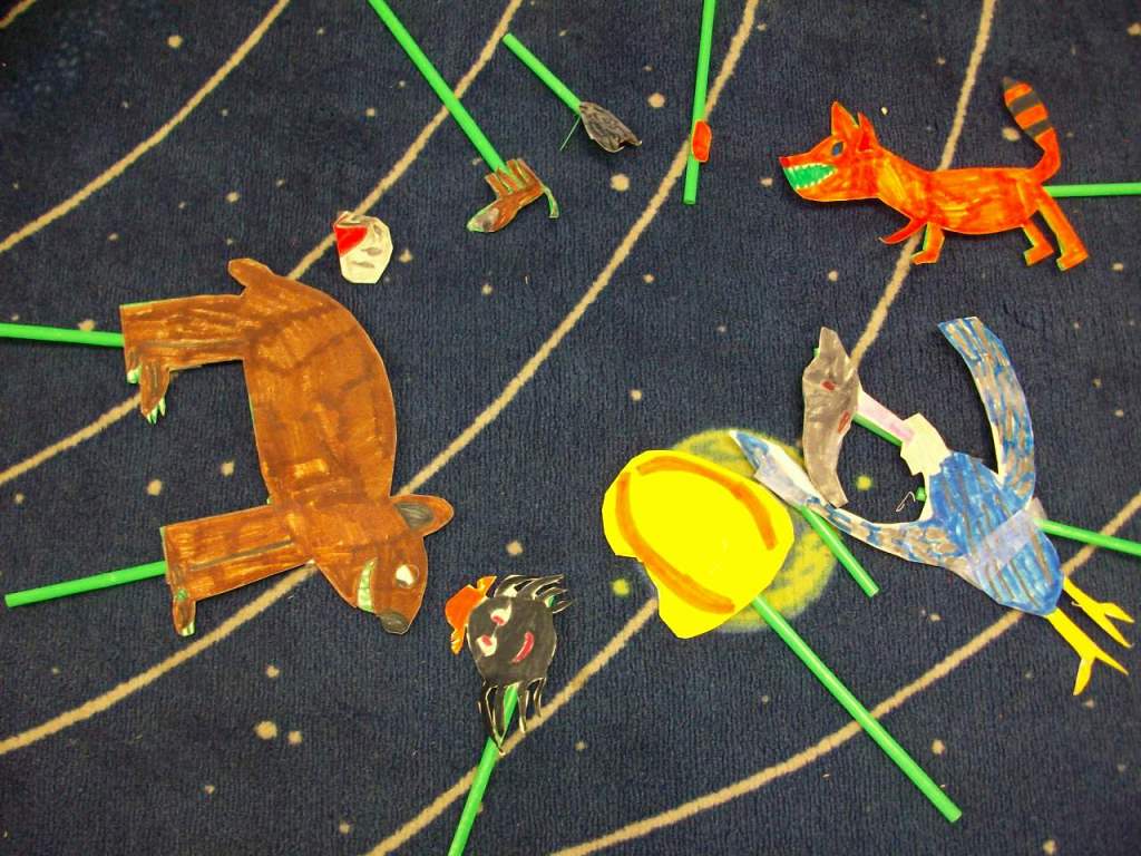 First, I do think stick puppets is the way to go over kids acting. It reduces pressure and self-consciousness. I found five folktale plays and began with groups reading independently for comprehension and then choosing parts and practicing fluency. Next, they created the puppet characters and props on a thick cardstock. TIP: Avoid green when coloring your puppets, because that part will take on the background image. If you really need green, use a different shade from your fabric. However, if you had small areas around an puppet that would be difficult to cut around, just use green and the background images should appear in that space. One of my groups were pure geniuses with this. They needed a flock of birds, but instead of making 6 individual birds, they colored green marker around the birds and cut them out as a big set. So clever! We attached green straws that matched the green background color. TIP: It’s easier to find different shades of green in fabric, so purchase your straws first, then bring one to the store and hold it up to each bolt of cloth. You’ll want them to be a very close match in order for the straws to disappear on screen.