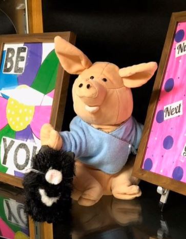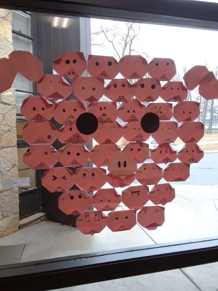 The entire school building was transformed during our five-week event. Check out the large world map that documented Flora’s travels. My co-worker marked new places each week as we read the story. As visitors came to the lobby, they could see just where we were in the journey. What a great geography connection, right? That same outstanding teacher make vocab displays in several locations throughout the building for mini-lessons on context clues. The art teacher helped students construct adorable origami pigs that collaged into this full-size window display. We also had chapter trivia questions and a weekly trivia video. Every day students hunted for our stuffed Flora hiding somewhere in the school. Check out this Adobe Spark video I created to summarize the entire experience!