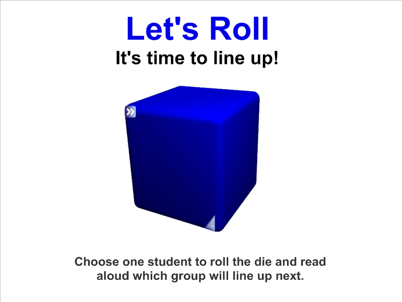 One of the greatest challenges for teachers is smooth transitions between activities. We often loose control of the class to chatter and chaos when we ask them to move from one location to another. In the SMART Notebook gallery, you will find a variety of dice. Choose one that can be edited. I prefer to label the six sides with table 1, table 2, table 3, etc. A student helper taps the die, and the next group to line up is decided. The students remain quiet as they anticipate the next roll. Movement is done in small chunks and so much time and energy is saved! Give it a roll in your classroom. You’ll just “die” for these smooth transitions!